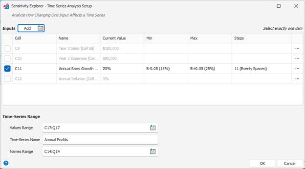 Start by selecting a single input.  If you have previously used this workbook with Sensitivity Explorer, your input may already be shown in the list.  If it is not yet there, click the Add button to add the cell.  (See the article Working with Inputs and Outputs for more information.)