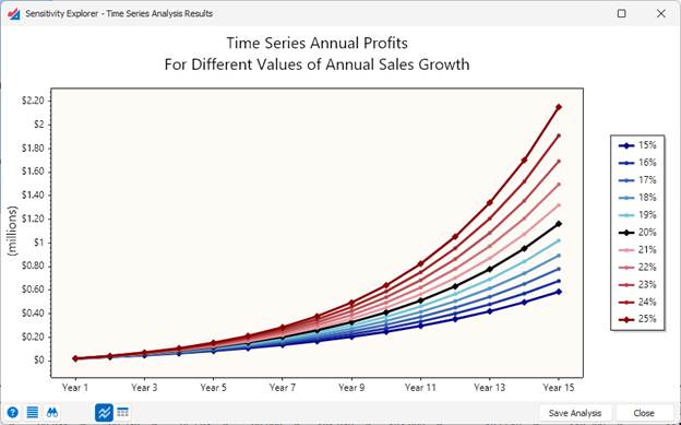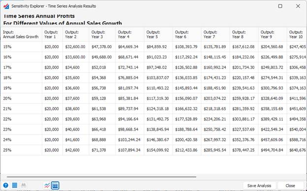 When you click the OK button, Sensitivity Explorer varies the input you selected across the range of values specified for it.  For each value, Excel recalculates your spreadsheet and records the time-series cells.