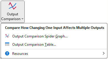The spider graph view displays, in detail, how the input affects the outputs. Since the outputs, in general, will have different scales and units, they are plotted in terms of relative change from their base-values. This allows them to be plotted on a single graph, and for easy comparisons to be made between them.