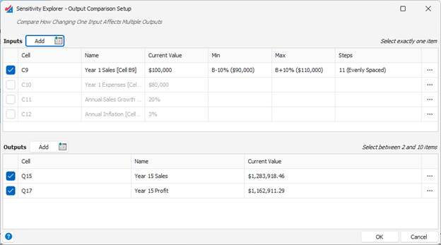 Start by selecting a single input and multiple outputs (a maximum of ten) from your workbook model. If you have previously used this workbook with Sensitivity Explorer, your inputs and outputs may already be shown in the lists. If they are not yet there, click the input or output “Add” button to add the cells. (See the article Working with Inputs and Outputs for more information.)