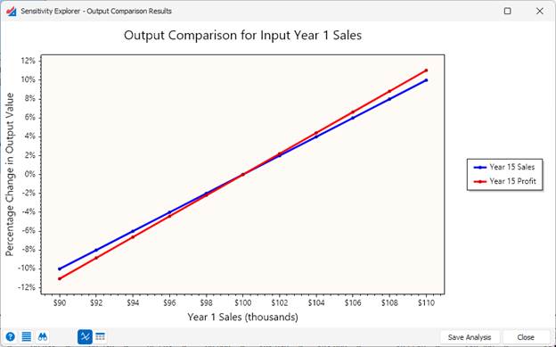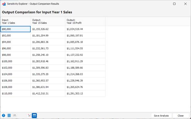 When you click the OK button, Sensitivity Explorer varies the input you selected across the range of values specified for it. For each value, Excel recalculates your spreadsheet and records all the output values.