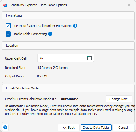 Use Input/Output Cell Number Formatting – If checked this will apply the cell number formatting of your input and output cells directly to the appropriate columns of the data table. Most of the time, this will be appropriate. However, sometimes that formatting might not have enough precision, and you can either uncheck this option, or override that number formatting manually.