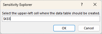 Once you’ve specified the inputs and outputs, the next step is to specify where the Data Table should be located. You will be prompted to supply the upper-left cell: