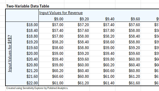 To make the data table, simply click the “Create Data Table” button in the Data Table Options dialog. Depending on which type of Excel data table you requested you will see either a one-variable or two-variable data table at the location you specified: